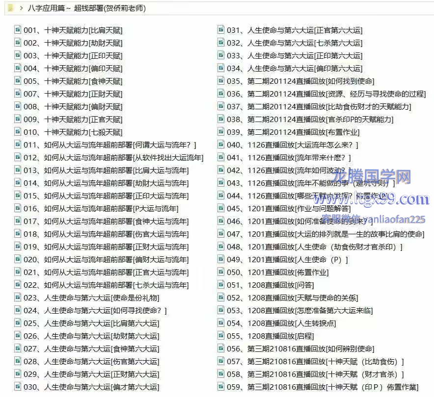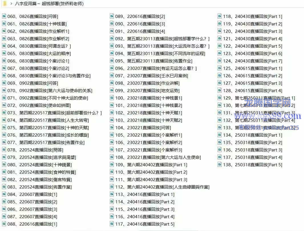 贺侨莉老师《八字应用篇~ 超前部署》教学视频138集。具体目录看图一图二