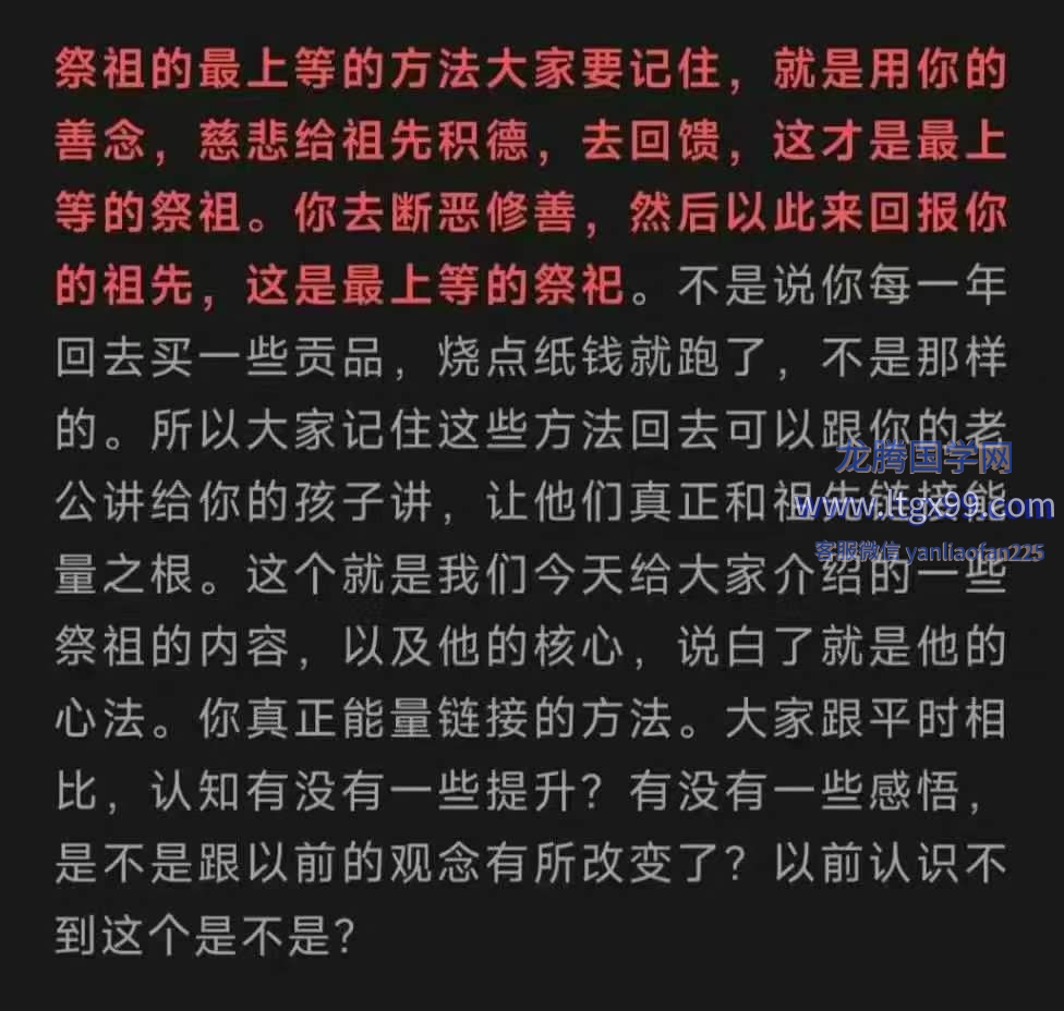 祭祖的最上等的方法大家要记住,就是用你的善念,慈悲给祖先积德,去回馈,这才是最上等的祭祖。你去断恶修善,然后以此来回报你的祖先,这是最上等的祭祀。不是说你每一年回去买一些贡品,烧点纸钱就跑了,不是那样的。所以大家记住这些方法回去可以跟你的老公讲给你的孩子讲,让他们真正和祖先链接能量之根。这个就是我们今天给大家介绍的一些祭祖的内容,以及他的核心,说白了就是他的心法。你真正能量链接的方法。大家跟平时相比,认知有没有一些提升?有没有一些感悟,是不是跟以前的观念有所改变了?以前认识不到这个是不是?