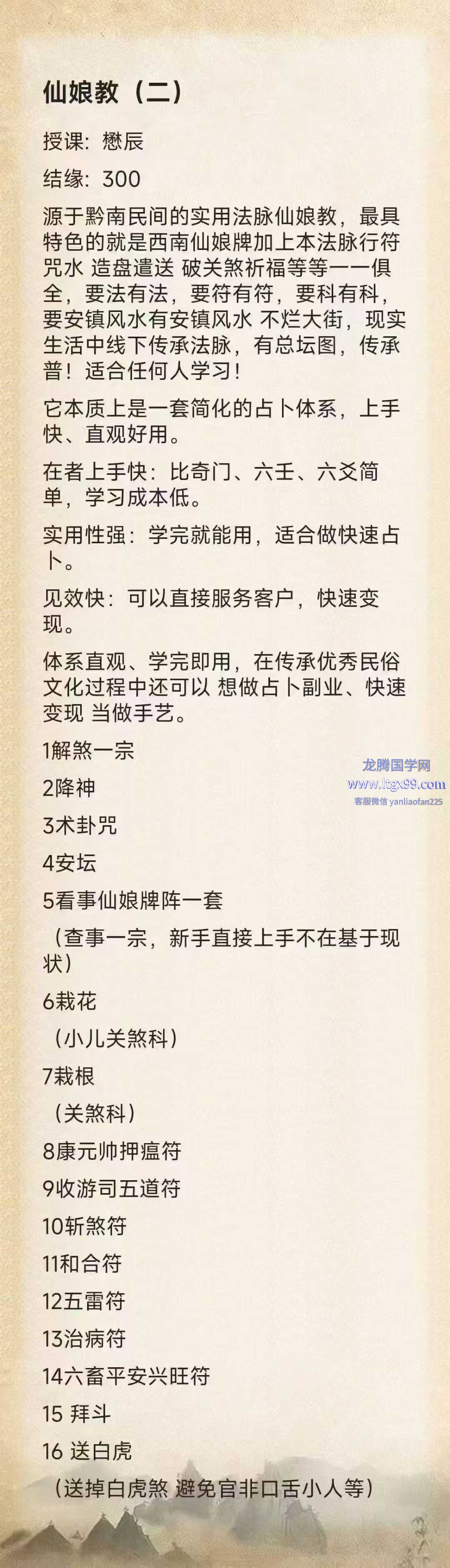源于黔南民间的实用法脉仙娘教,最具特色的就是西南仙娘牌加上本法脉行符咒水 造盘遣送 破关煞祈福等等一一俱全,要法有法,要符有符,要科有科,要安镇风水有安镇风水不烂大街 适合任何人学习!
