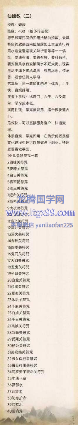 源于黔南民间的实用法脉仙娘教,最具特色的就是西南仙娘牌加上本法脉行符咒水 造盘遣送 破关煞祈福等等一一俱全,要法有法,要符有符,要科有科,要安镇风水有安镇风水不烂大街 适合任何人学习!