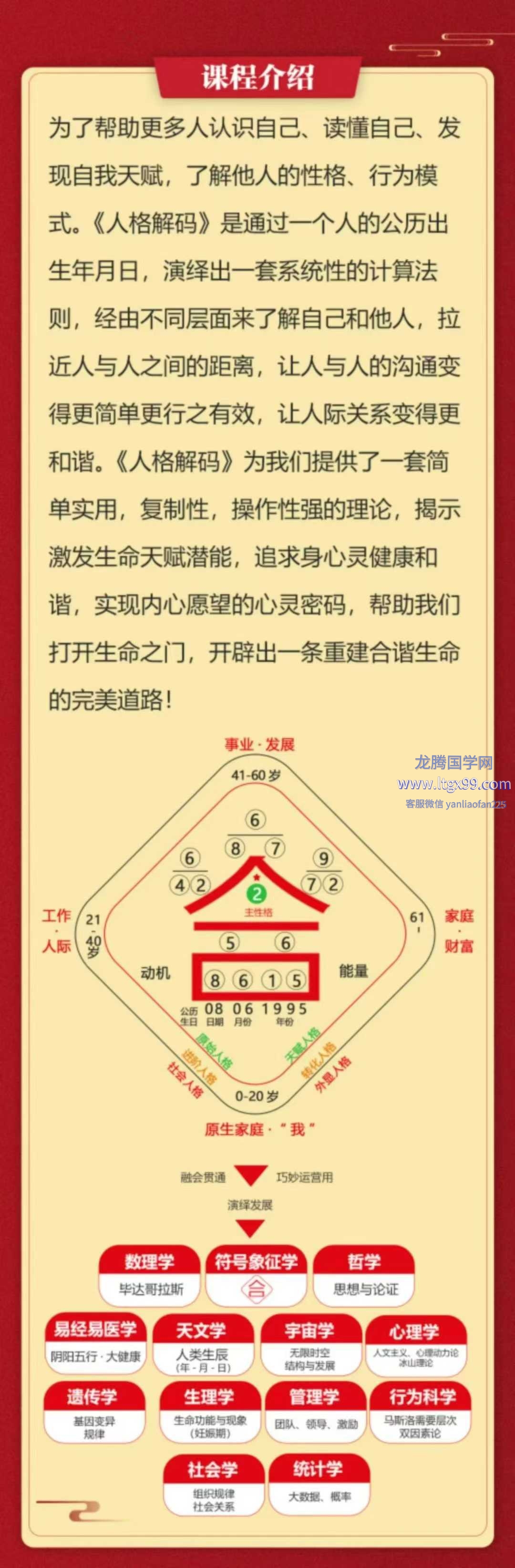 ✨为帮了助多更人认自识己、读自懂己、发自现我天赋,了他解人的性格、行模为式。《格人解码》是一通过个的人历公出生年月日,绎演出一套统系性计的算法则,经不由同层面来了自解己他和人,拉近与人人之的间距离,人让与人的通沟变得更单简更行有之效,让关人际系得变更和谐。《格人解码》为我提们供了一简套单实用,复制性,操性作强的理论,示揭激生发天命赋潜能,追身求心健灵康和谐,实现愿内心望的心灵密码,帮助打我们开生之命门,开出辟条一重建谐合生命的美完道路!