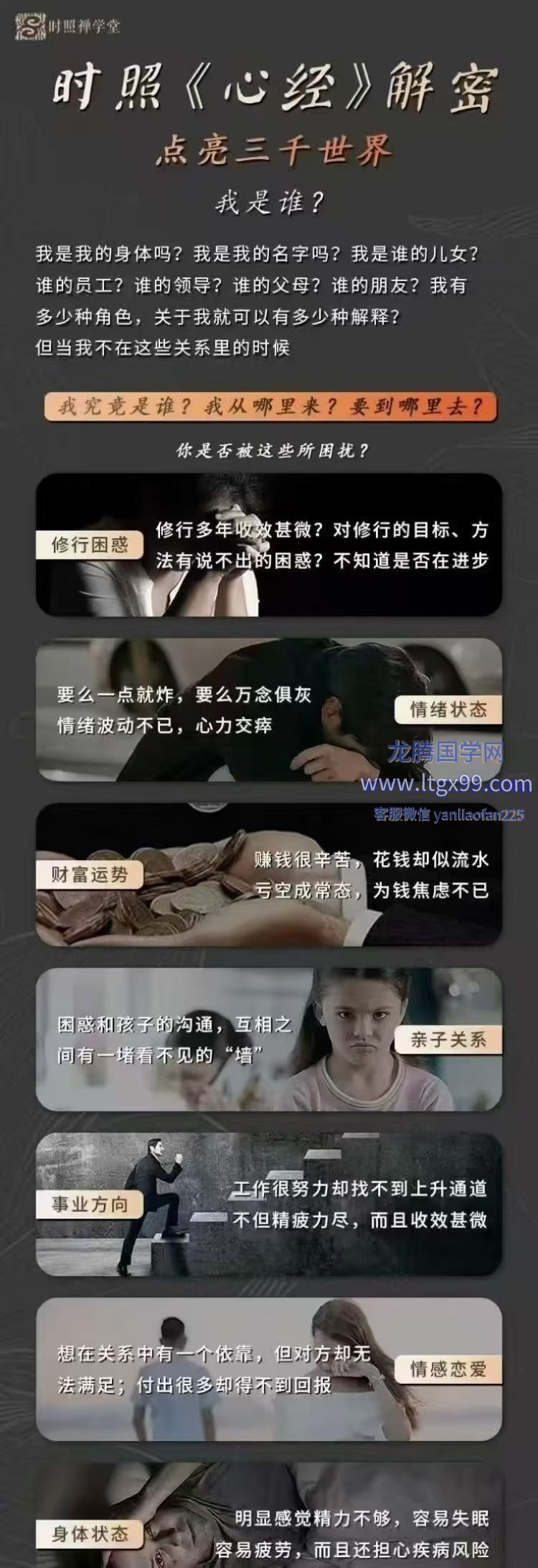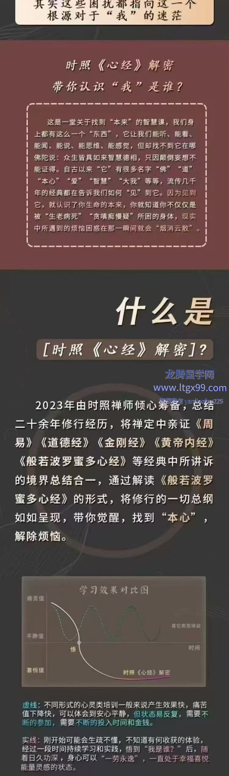 2023年由时照禅师倾心筹备,总结二十余年修行经历,将禅定中亲证《周易》《道德经》《金刚经》《黄帝内经》《般若波罗蜜多心经》等经典中所讲诉的境界总结合一,通过解读《般若波罗蜜多心经》的形式,将修行的一切总纲如如呈现,带你觉醒,找到“本心”解除烦恼。