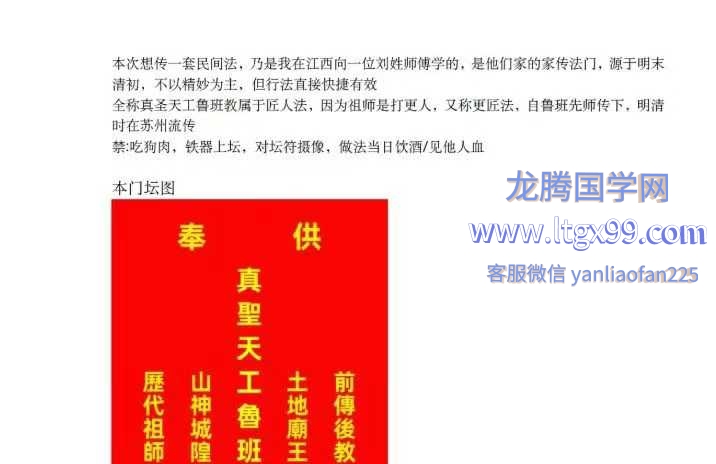 课程简介:本次想传一套民间法,乃是我在江西向一位刘姓师傅学的,是他们家的家传法门,源于明末清初,不以精妙为主,但行法直接快捷有效全称真圣天工鲁班教属于匠人法,因为祖师是打更人,又称更匠法,自鲁班先师传下,明清时在苏州流传